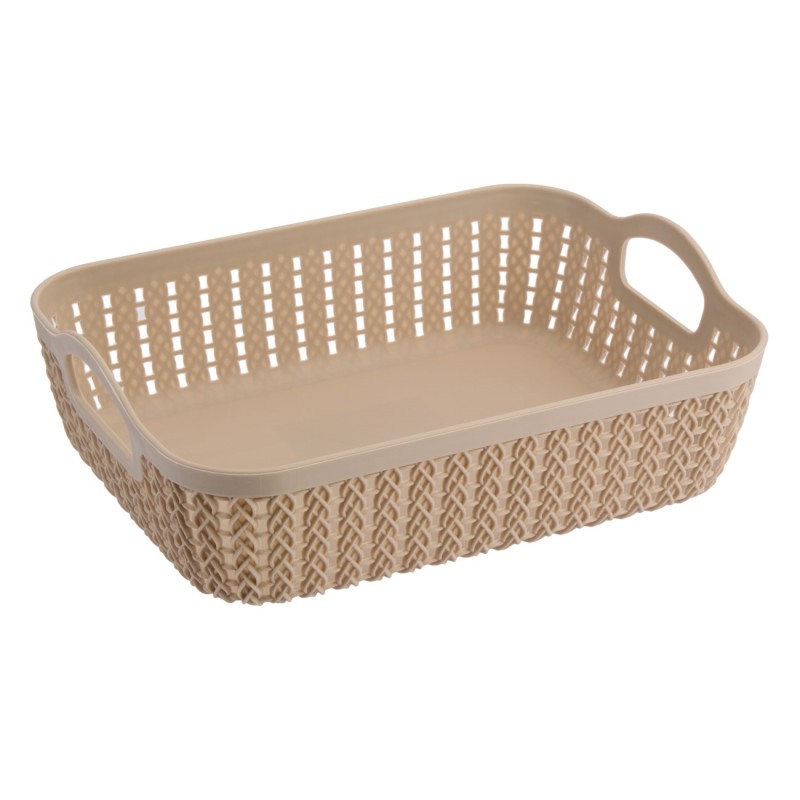 Универсална кошница за съхранение тип панер, изработена от висококачествена пластмаса, която имитира плетка в светло кафяв цвят с удобни дръжки за лесно носене.