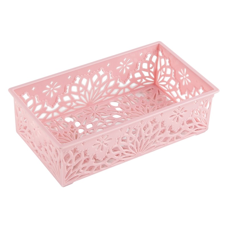 Функционална кошница за съхранение тип касетка, изработена от устойчива пластмаса в розов цвят с декоративни перфорации във формата на цветя.