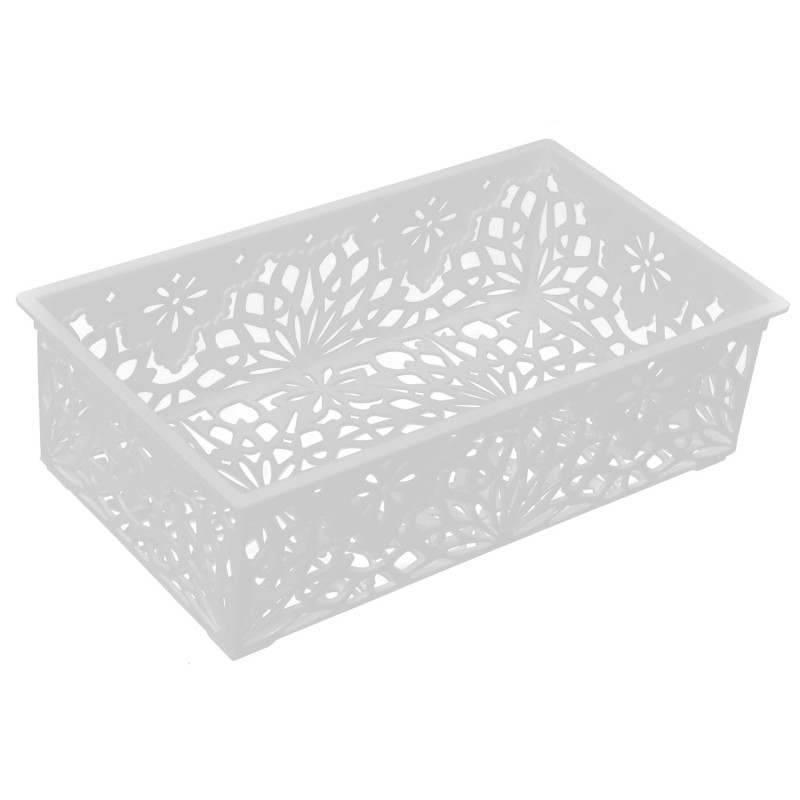 Практична кошница за съхранение тип касетка, изработена от устойчива пластмаса в бял цвят с декоративни перфорации във формата на цветя.