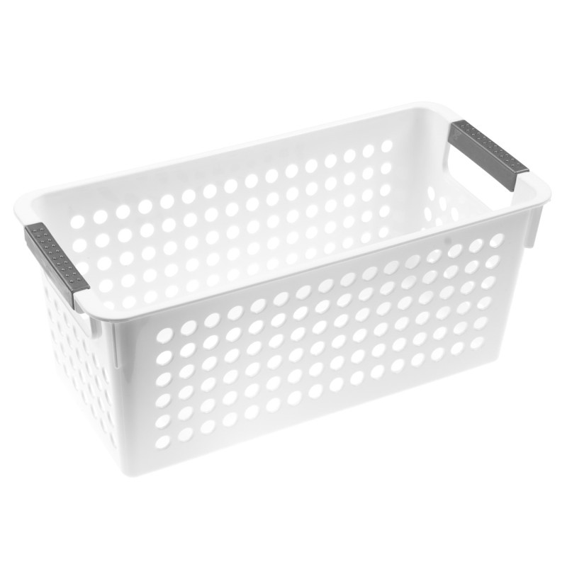 Функционална кошница за съхранение изработена от висококачествена пластмаса в бял цвят с удобни дръжки за лесно носене.