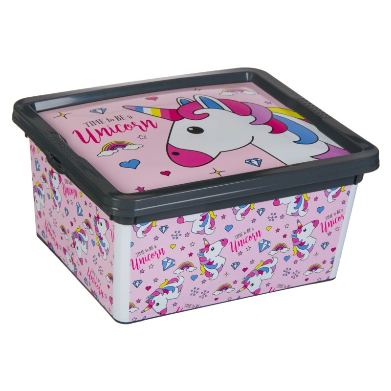 Функционална кутия за съхранение изработена от висококачествена непрозрачна пластмаса в розов цвят с капак и щампа на еднорог.