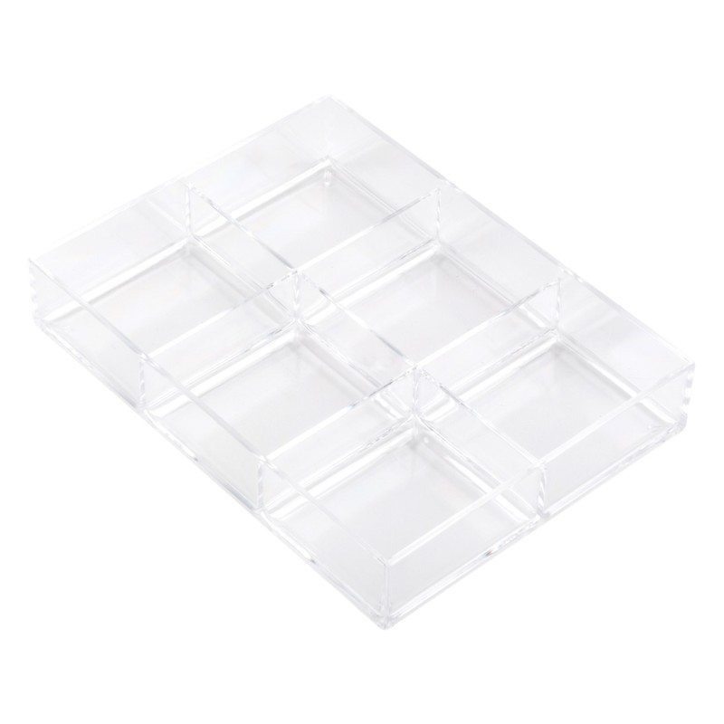 Кутия-огранайзер за бижута, изработена от качетвена прозрачна пластмаса с 6 отделения - за гривни, пръстени, обеци и др.