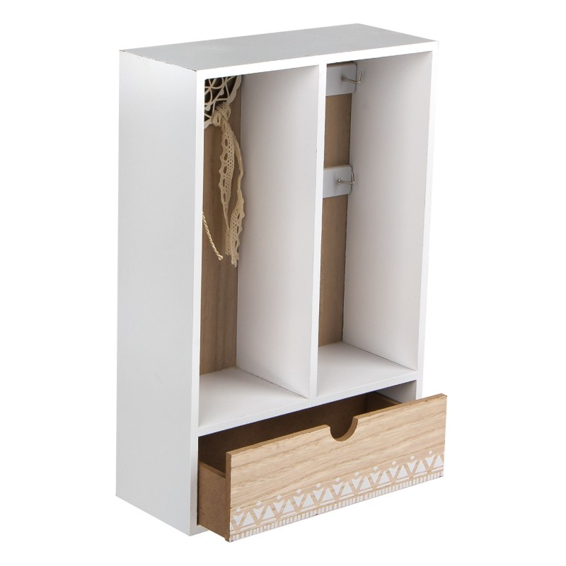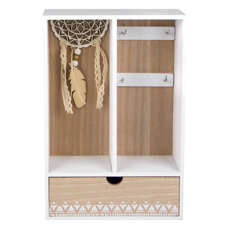 Кутия-огранайзер за бижута във формата на гардероб, изработена от качетвена дървесина в естествен цвят с декоративен индиански амулет Ловец на сънища, 2 отделения и едно чекмедже - за гривни, пръстени, обеци и др.