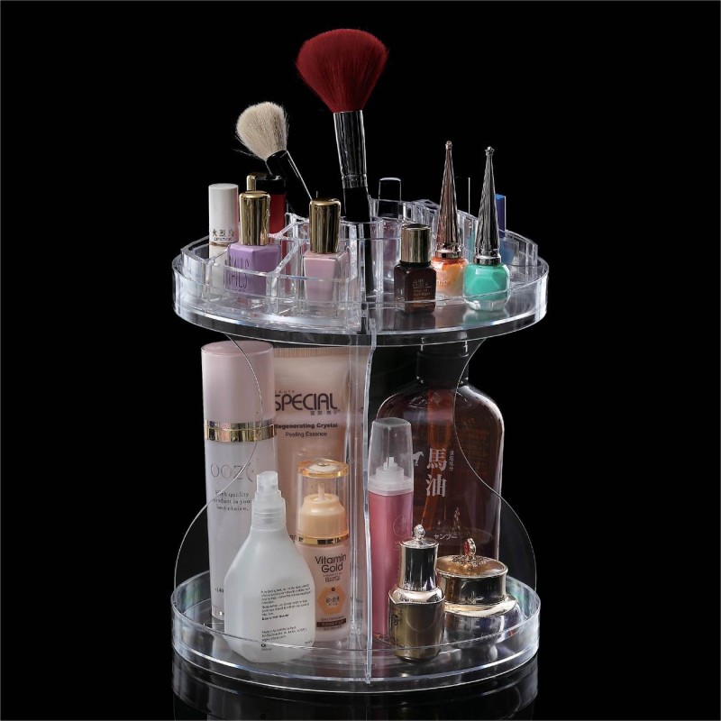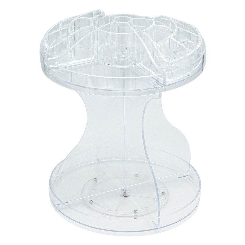 Професионален въртящ се огранайзер за гримове и козметични продукти, изработен качетвена прозрачна пластмаса на 2 нива.