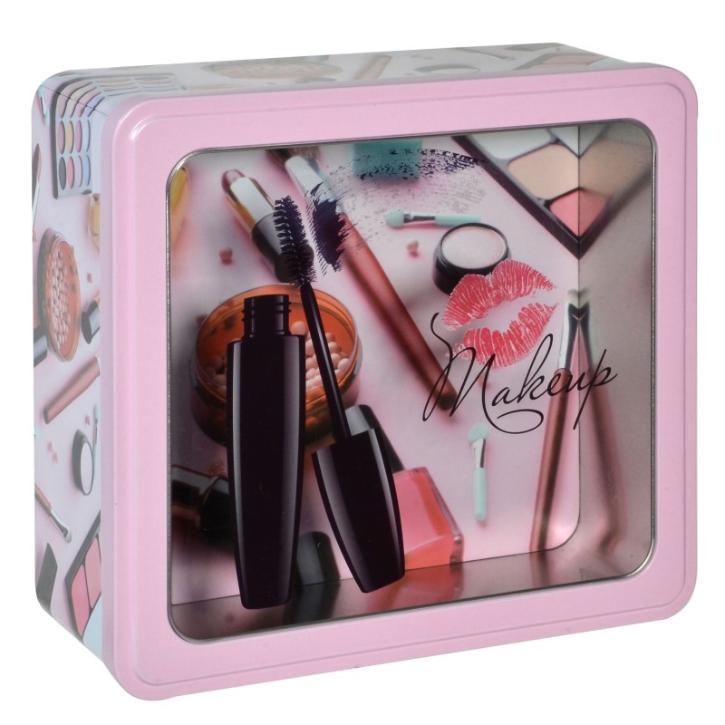 Кутия за съхранение на гримове, изработена качетвена метална сплав в розов цвят с прозрачен капак и тематична щампа.
