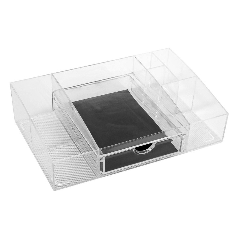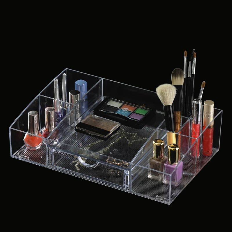 Комбиниран огранайзер за гримове и бижута, изработен качетвена прозрачна пластмаса със 7 отделения - за четки, моливи, червила, лакове и други и едно чекмедже за гривни, пръстени и др.