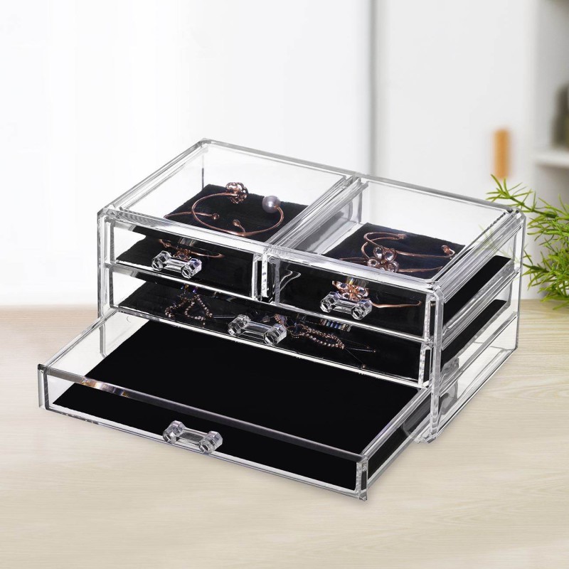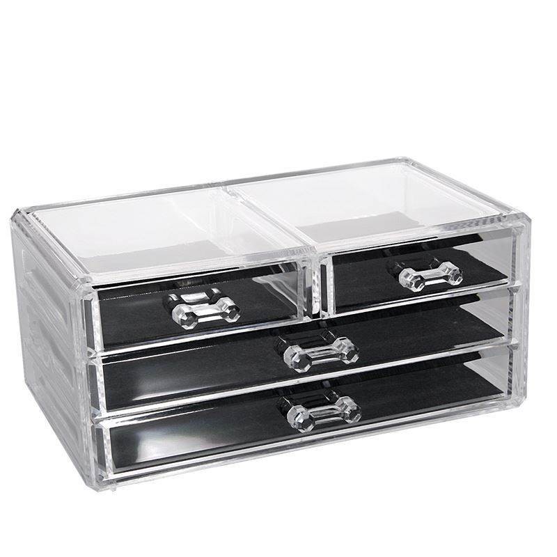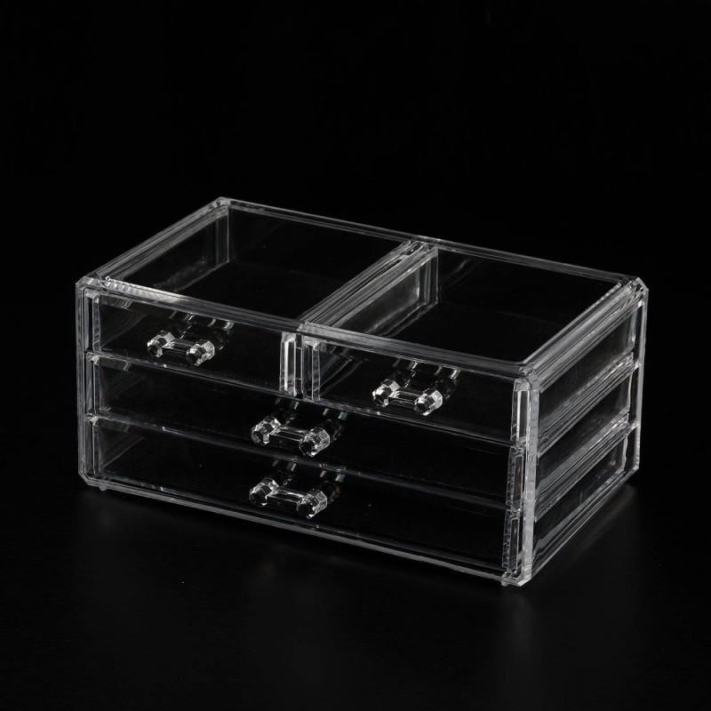 Кутия-органайзер за съхранение на гримове, изработена качетвена прозрачна пластмаса с 4 чекмеджета.