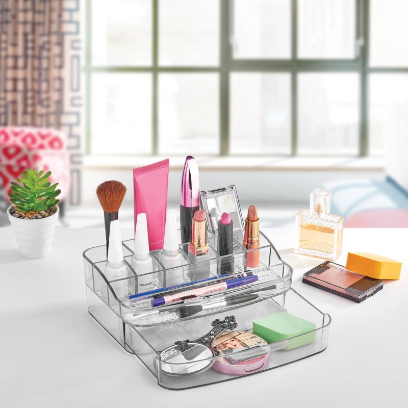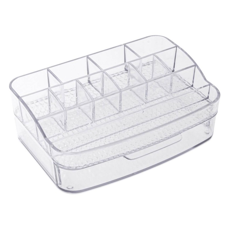 Комбиниран огранайзер за гримове, изработен качетвена прозрачна пластмаса с 12 отделения - за четки, моливи, червила, лакове и други и едно чекмедже.