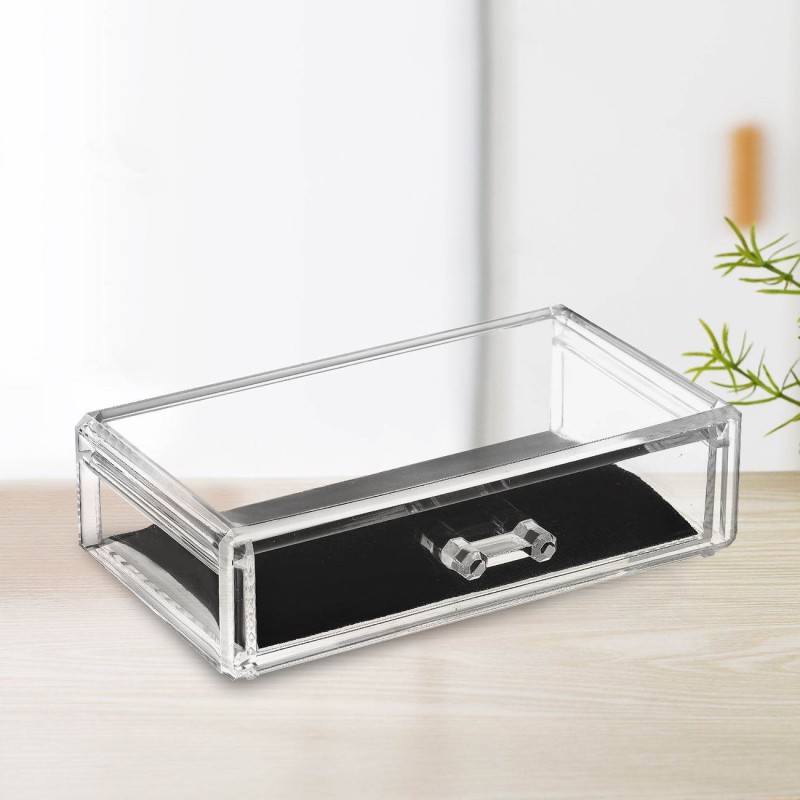 Кутия-органайзер за съхранение на гримове, изработена качетвена прозрачна пластмаса с чекмедже.