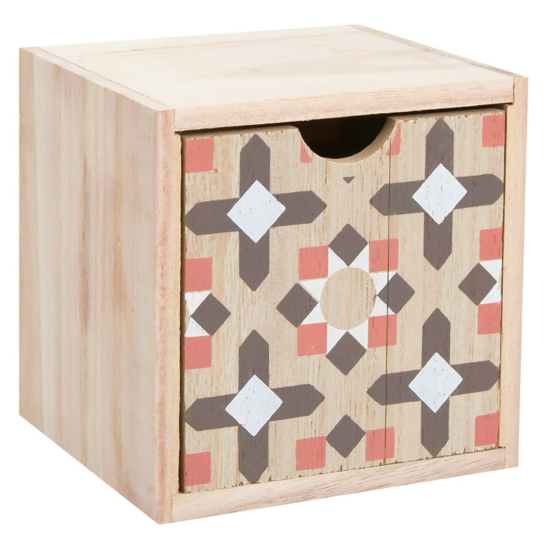 Декоративна кутия за ключове, изработена от висококачествена дървесина в естествен цвят с чекмедже с красиви шарки в червено и кафяво.