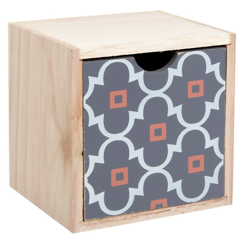 Практична кутия за ключове, изработена от висококачествена дървесина в естествен цвят с чекмедже с декоративни шарки.