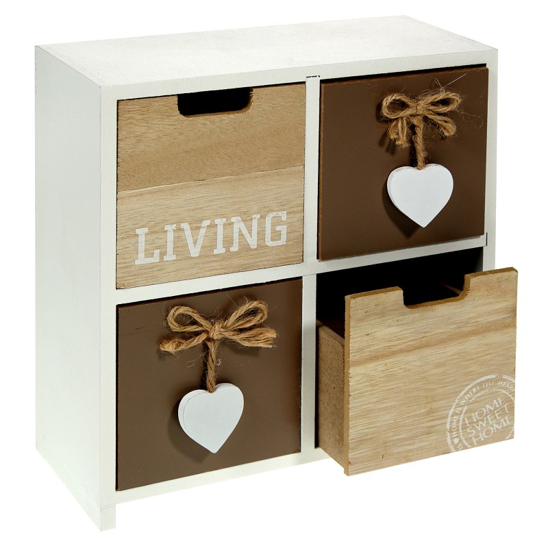 Атрактивна кутия за ключове, изработена от висококачествена дървесина в бял цвят с 4 чекмеджета в бежово и кафяво с декоративни сърца.