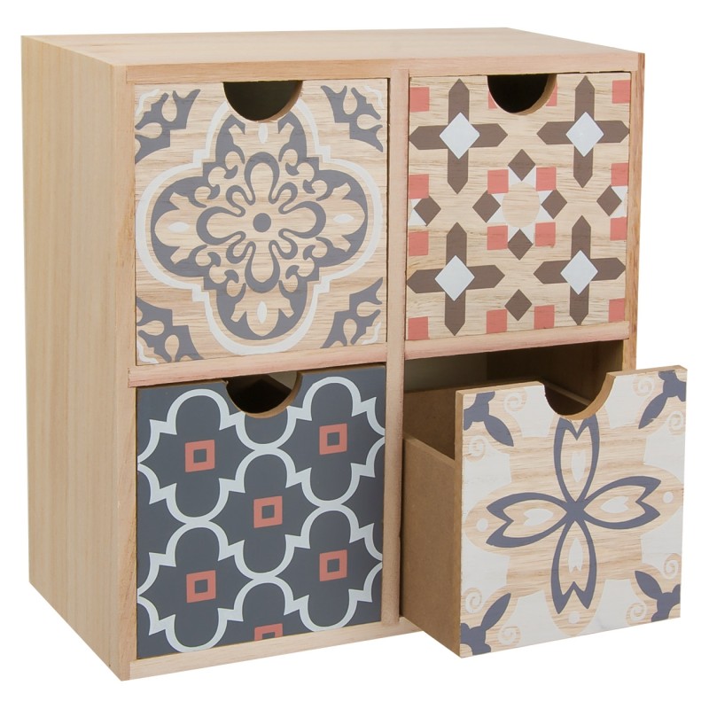 Стилна кутия за ключове, изработена от висококачествена дървесина в естествен цвят с 4 чекмеджета с красиви декоративни шарки.