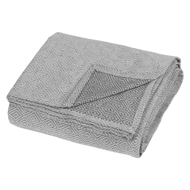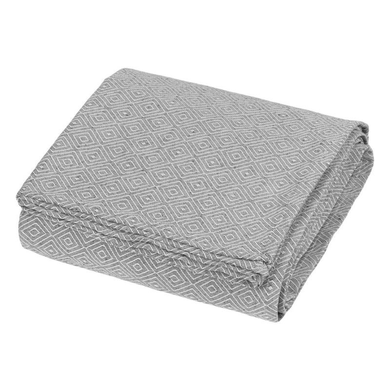 Декоративно сиво хвърляне с релефен дизайн на ромб. Покрива триместен диван. Идеален за всеки сезон.