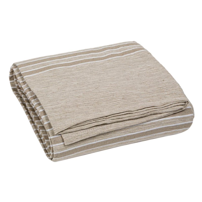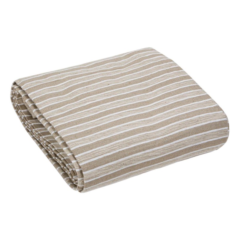 Бежово-кафяво декоративно хвърляне на райета с бежови ивици и бежова изкуствена кожа. Идеална декорация за всеки сезон.