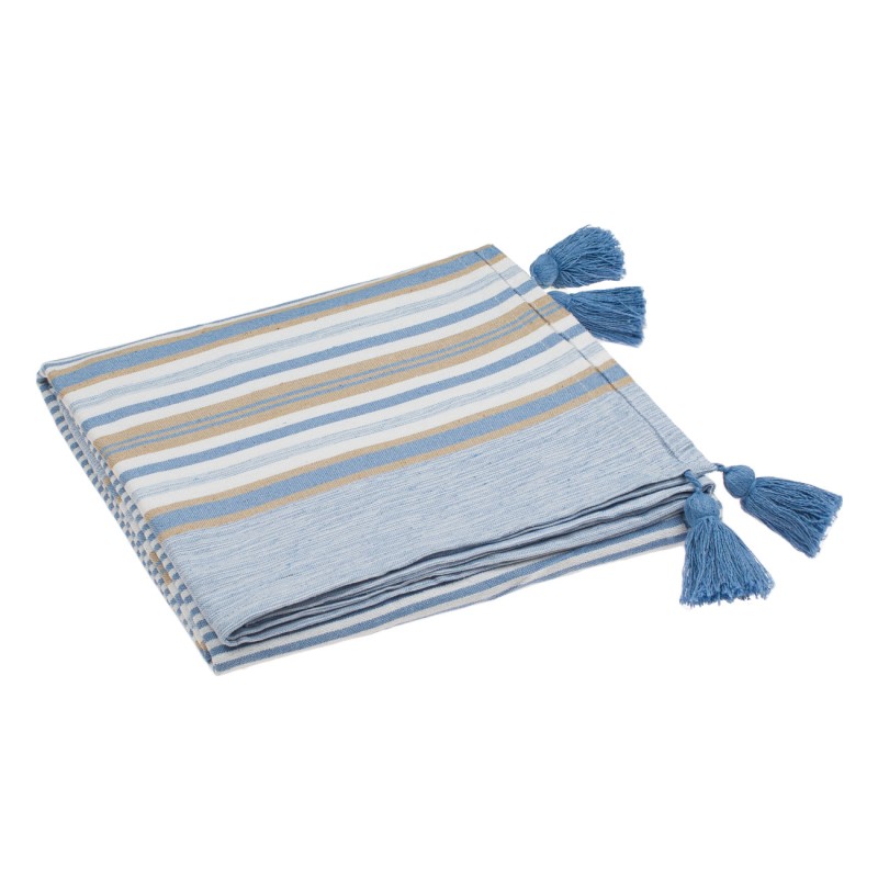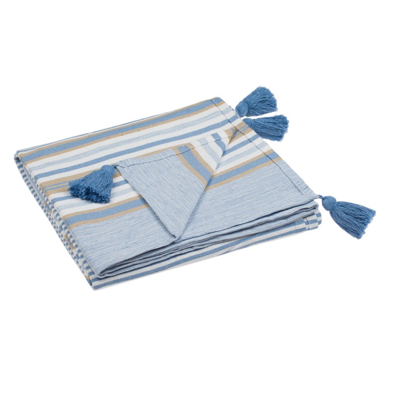 Декоративно хвърляне за фотьойл в цвят тил с бежови и бели ивици и пискюли в четирите ъгъла. Идеално за летните месеци.