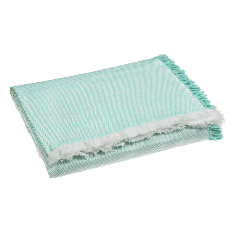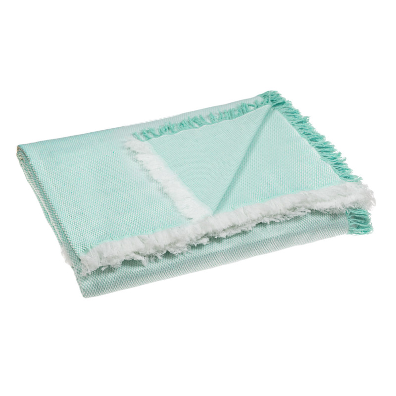 Декоративен хвърлей за триместен диван в мента и бяло с релефен дизайн и ресни в бяло и мента от всяка страна. Идеална декорация за летните месеци.