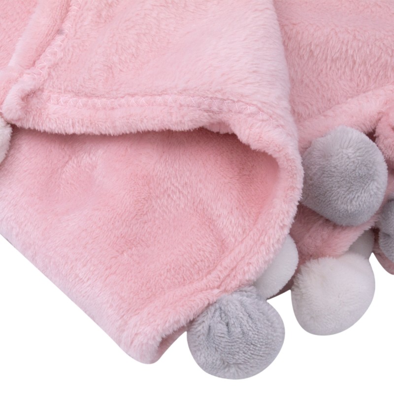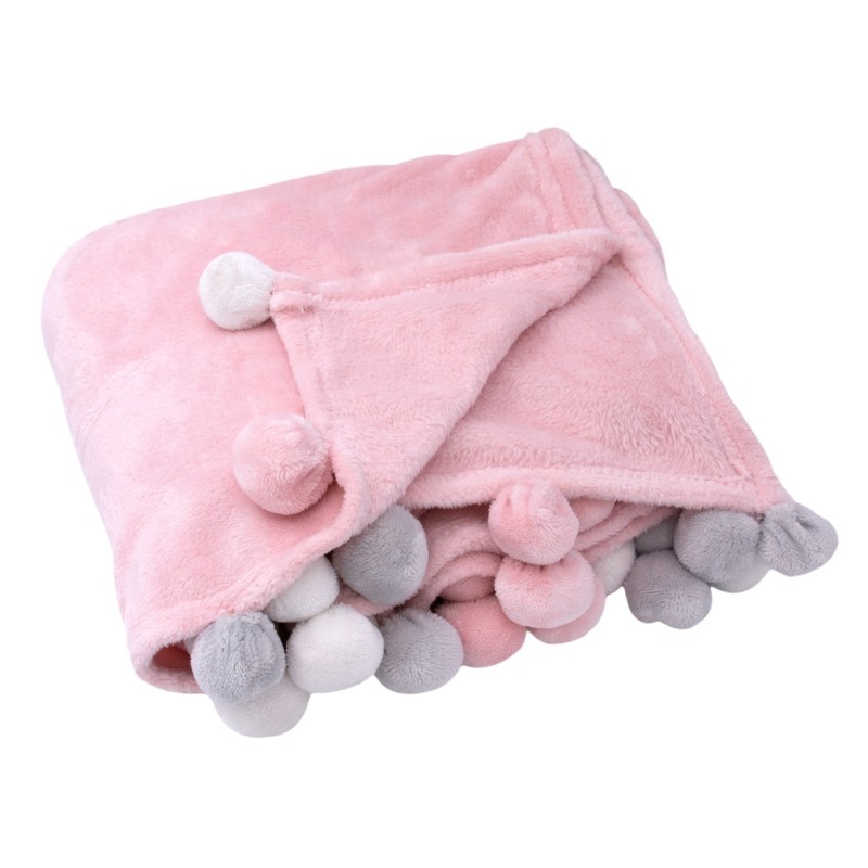 Декоративна покривка за диван, канапе, легло и др. в розов цвят, обрамчена с разноцветни помпони.