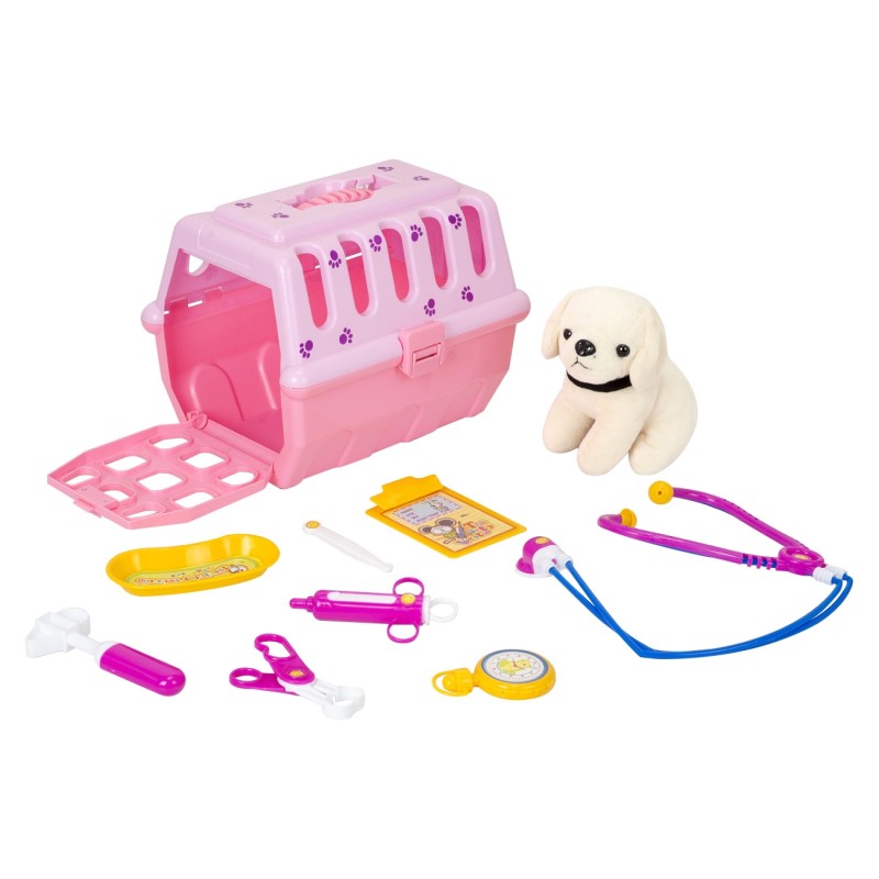 Плюшено кученце с транспортна клетка и лекарски инструменти и аксесоари - стетоскоп, спринцовка, термометър, рефлексно чукче, медицински картон, ножица, легенче и компас.