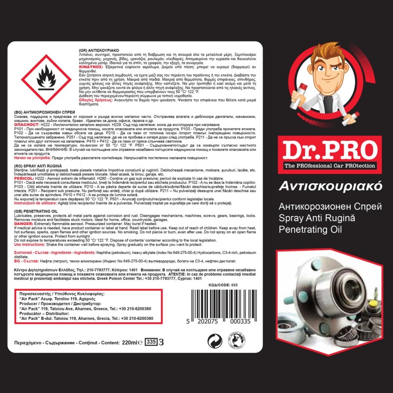 Отстранява влагата и деблокира двигатели, механизми, машини, винтове, зъбни колела, брави.