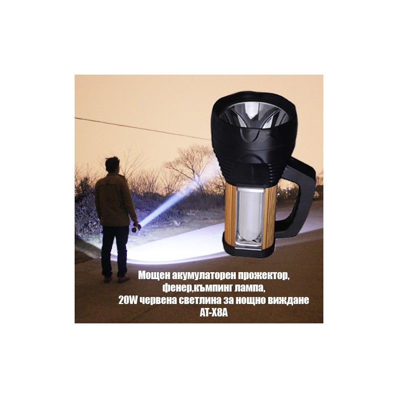 Мощен акумулаторен прожектор,фенер,къминг лампа,20W червена светлина за нощно виждане DAT AT-X8A