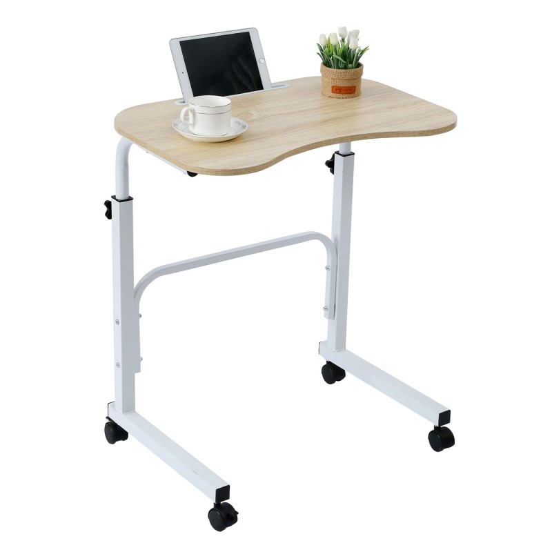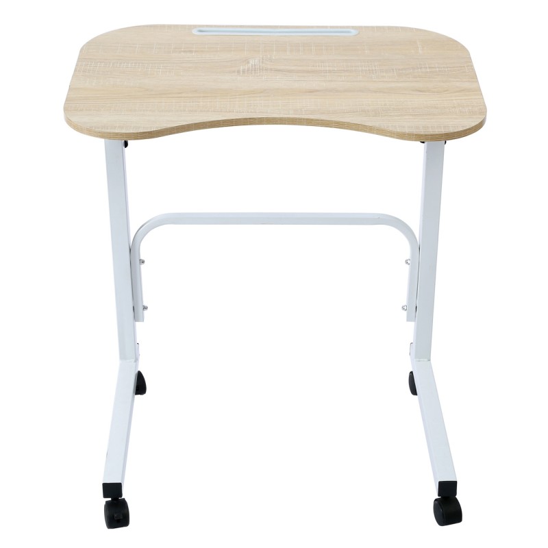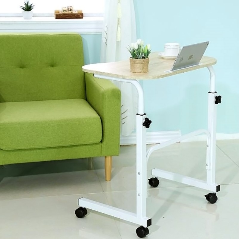 Практична и компактна помощна масичка с метална рамка в бял цвят, дървен плот в естествен цвят и колелца.