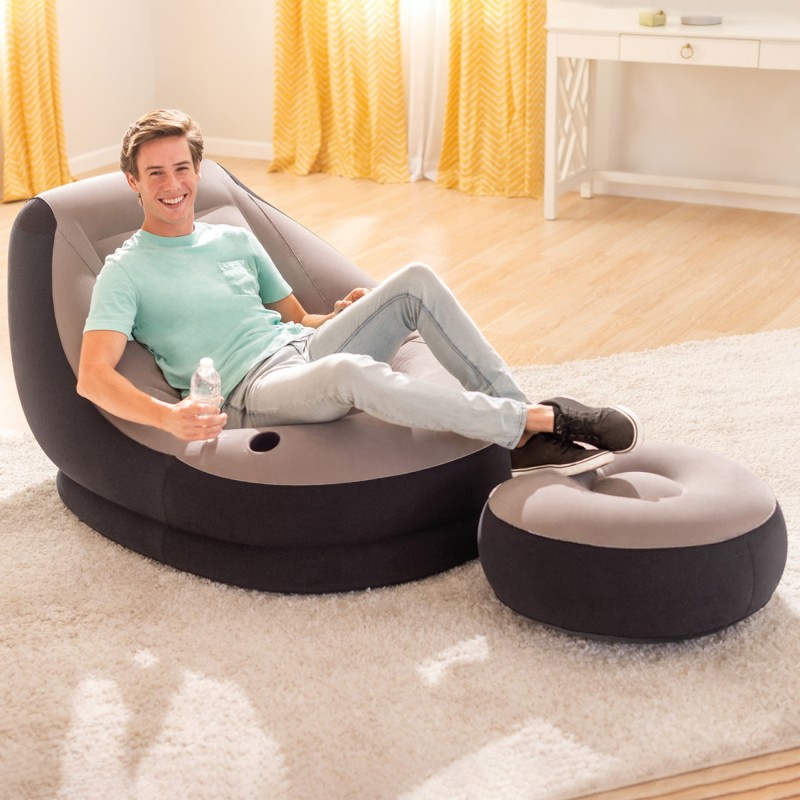 Удобен и стилен надуваем фотьойл в сиво и черно, изработен от здрави и устойчиви материали с противоплъзгаща система в долната си част, която предотвратява случайното му преместване по пода.