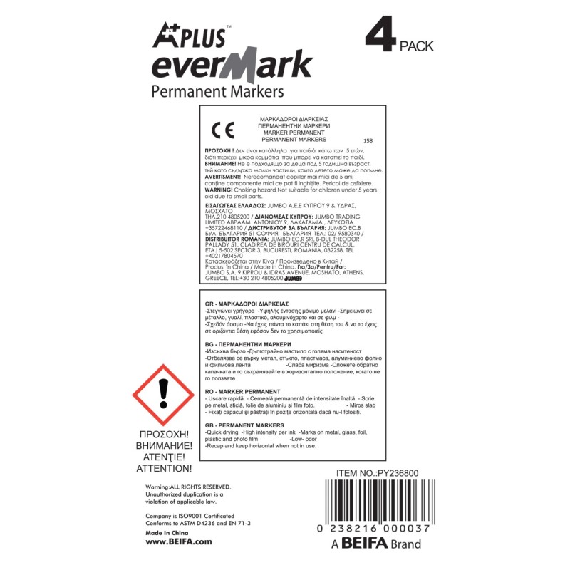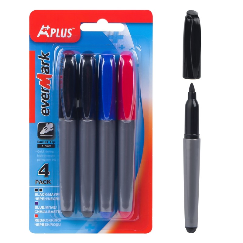 Комплект от 4 броя перманентни маркери в 3 цвята - 2 черни, 1 син и 1 червен.