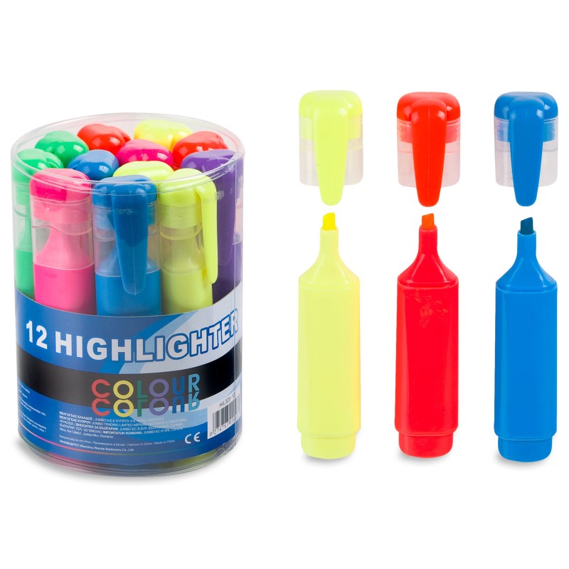 12 броя текст маркери в 6 цвята - 3 жълти, 2 зелени, 2 оранжеви, 2 цикламени, 2 сини и 1 лилав в практична пластмасова кутия с капак за лесно съхранение.