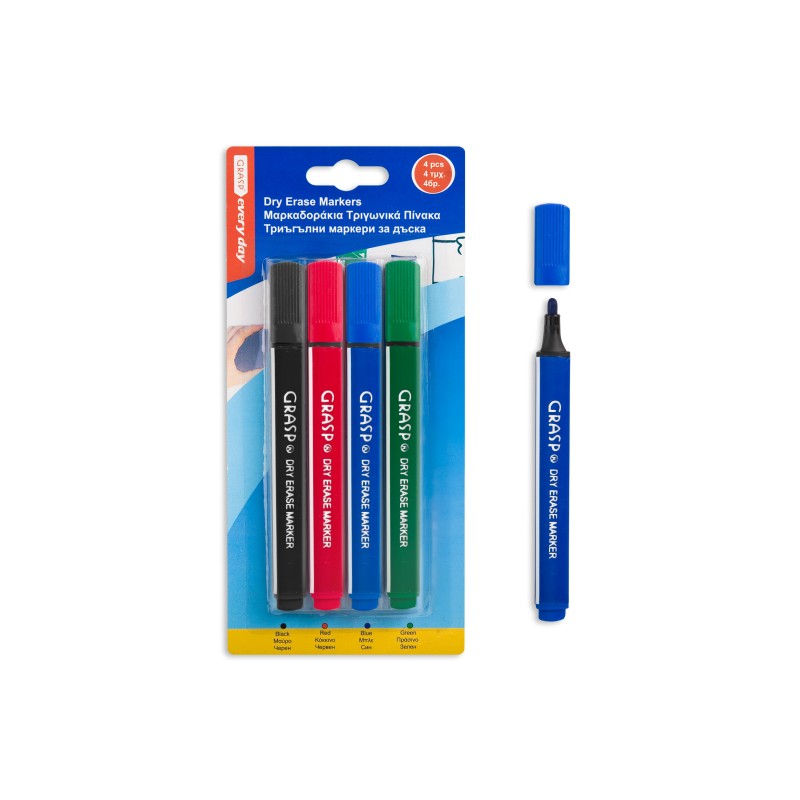 Комплект от 4 броя триъгълни маркери за бяла дъска в различни цветове за максимален ефект от направената презентация - черен, червен, син и зелен.
