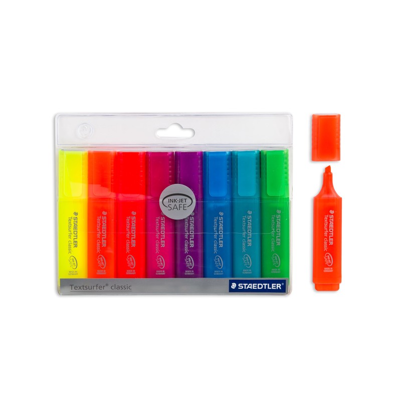Практичен комплект от 8 броя текст маркери STAEDTLER в 8 цвята - жълт, оранжев, червен, цикламен, лилав, син, светло син и зелен.