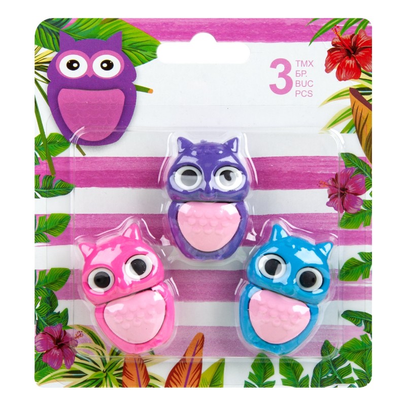 Комплект от 3 броя детски 3D гуми за моливи във формата на сови в различни цветове - синьо, лилаво и розово, които ще зарадват всяко дете, което обича животните.
