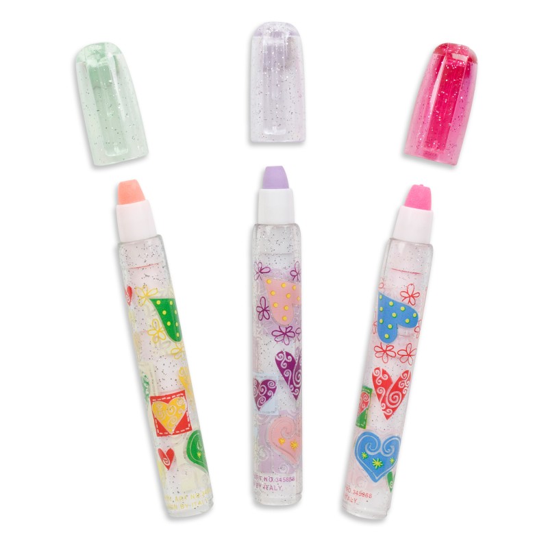 Комплект от 3 броя детски гуми за моливи във формата на цветни моливи с принт на сърца в различни цветове - червено, лилаво и оранжево.