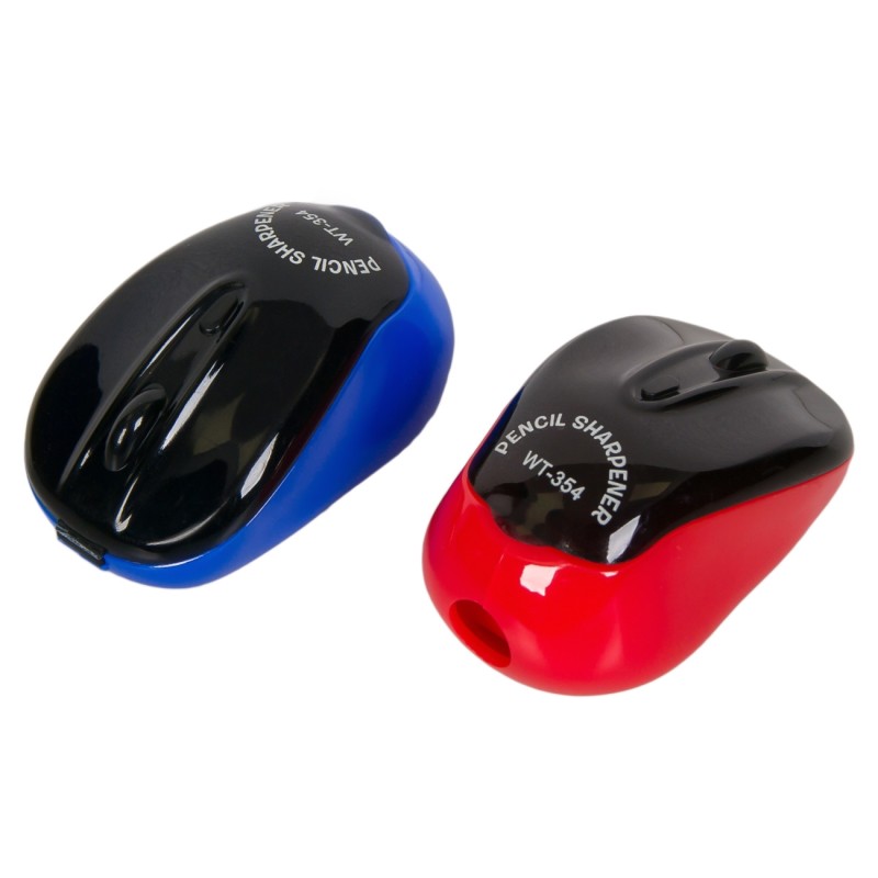 Комплект от 2 броя пластмасови единични острилки във формата на компютърни мишки в син и червен цвят.