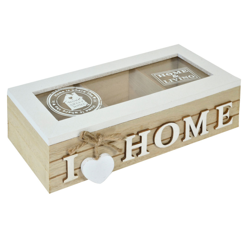 Правоъгълна кутия с три отделения за съхранение, изработена от висококачествена дървесина в естествен цвят с декоративен надпис I love HOME.