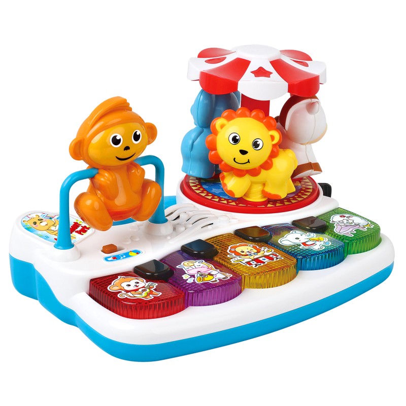 Увлекателната играчка разполага с разноцветни клавиши с различни забавни мелодии и звуци, 3 животни (коте, лъвче и слонче), които се люлеят на въртележката и игрива маймунка.