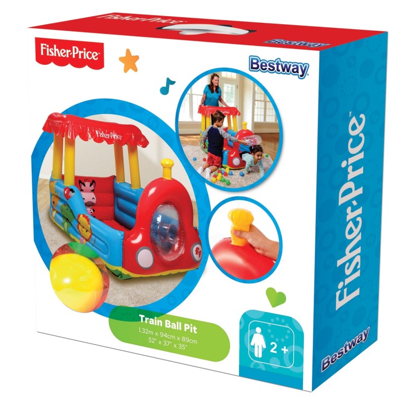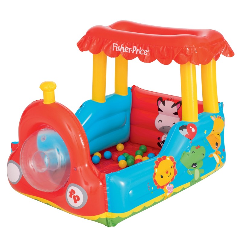 Детски надуваем влак Fisher Price в ярки цветове с картинки на животни заедно с 50 разноцветни пластмасови топчета с диаметър 5.5 см.