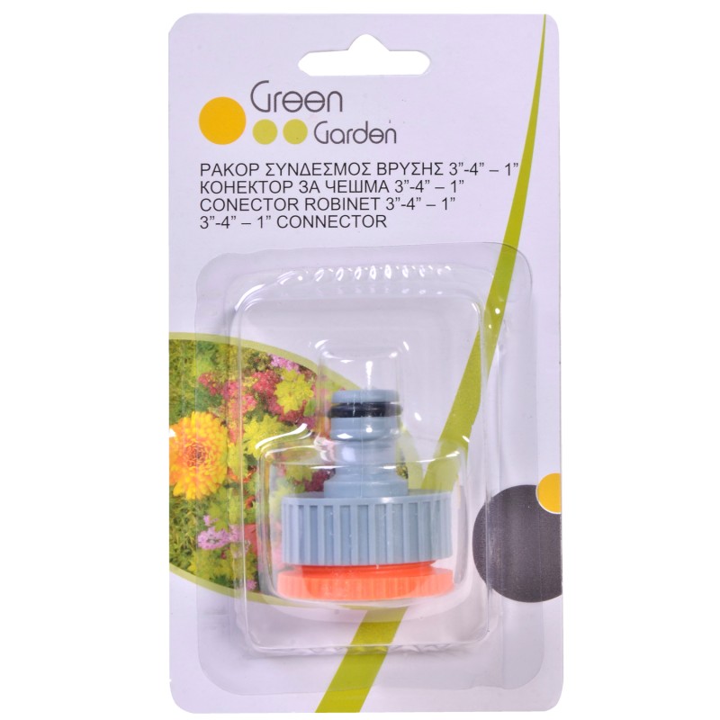 Конектор за свързване на градински маркуч към чешма, изработен от здрава пластмаса.