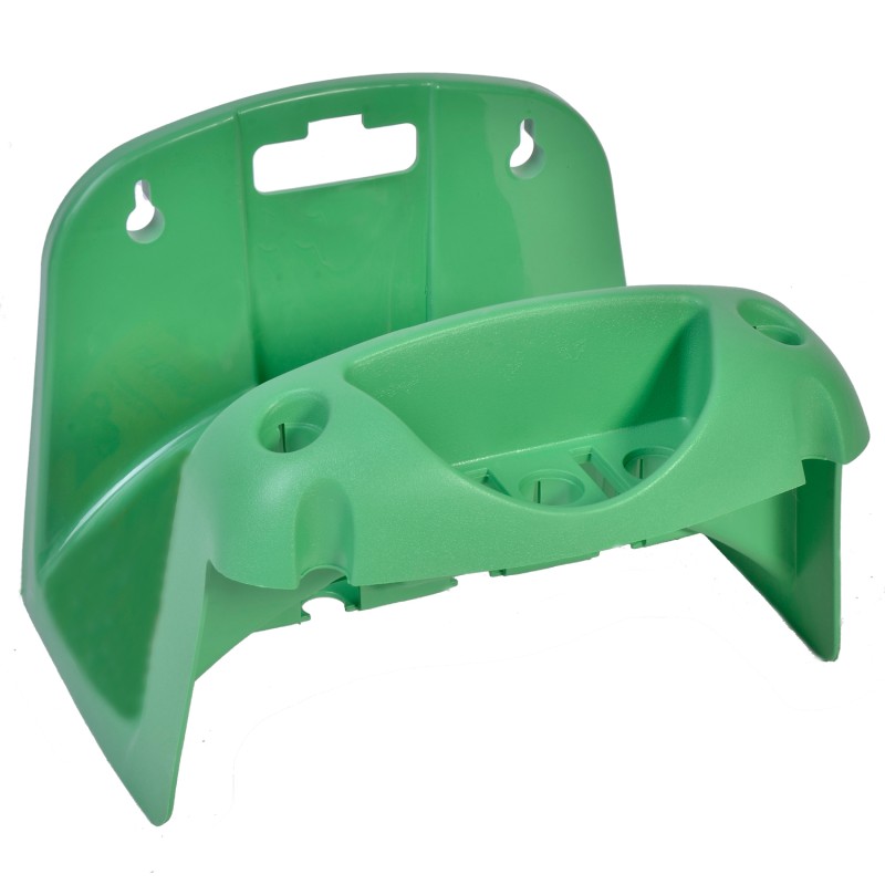 Удобна стенна поставка за градински маркуч, изработена от пластмаса в зелен цвят - перфектна за градината, вилата, двора и всяко друго място, където се използва маркуч.
