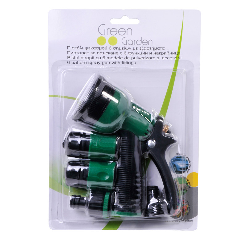 Пистолет, изработен от здрава пластмаса с регулируем накрайник с шест функции на поливане: душ-мъгла, конусна струя, централна струя, плоско-хоризонтална струя, мъгла, твърда струя, което позволява избирането на най-подходящ режим за напояване, както и за почистване. Има фиксатор на спусъка за непрекъсната работа.