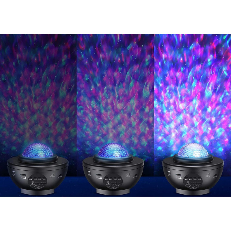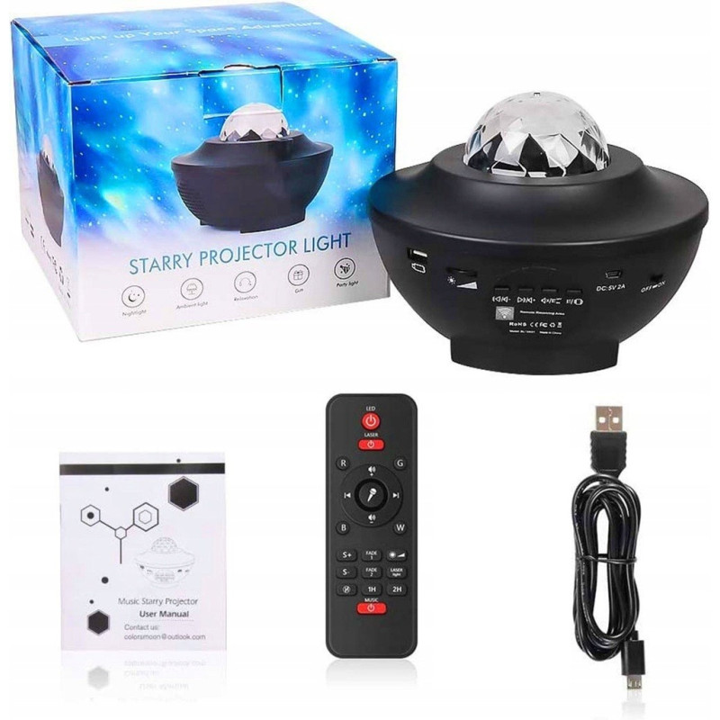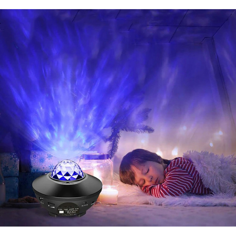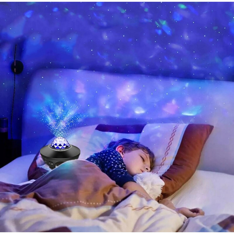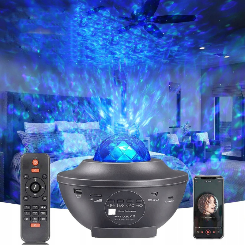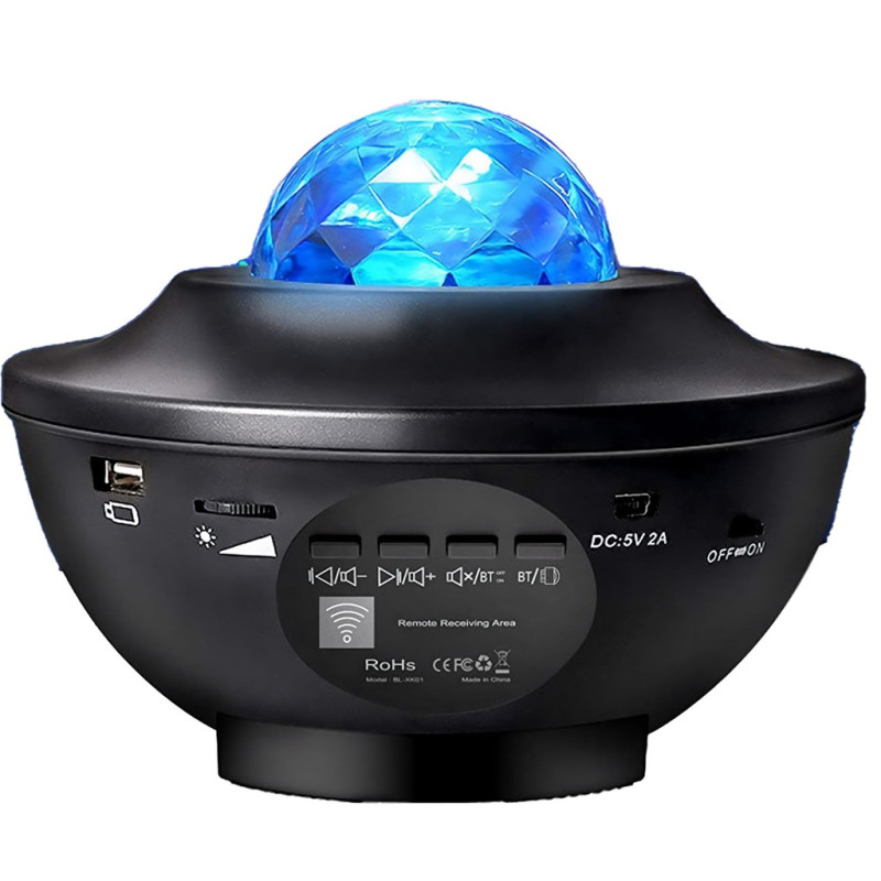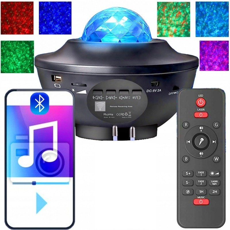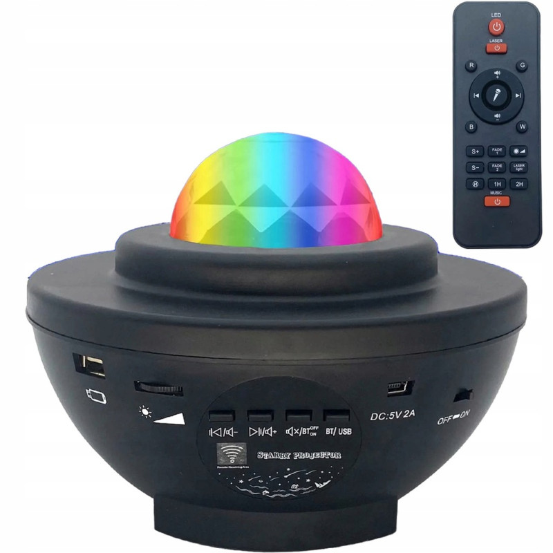 Страхотен RGB прожектор с вградена колонка с bluetooth. Проектираща лампа ще изпълни стаята с магически съзвездия, цветни картинки и неподозирани ефекти. Нежните светлини, които ще се гонят по стените и тавана действат успокояващо и приканват съня да дойде по-бързо. Колонката може да работи с USB(флашка) или блутут. От дистанционното можете да настройте лампата да свети с фабрично зададените програми или да изберете програмата при която светлината реагира на звуците. Също така може да се настройва след колко време да се изгаси(1 или 2ч.). Романтичен подарък или забавление за вашето дете, отличен избор за подарък по случай някой празник.