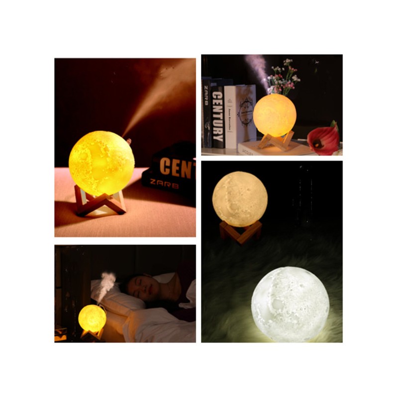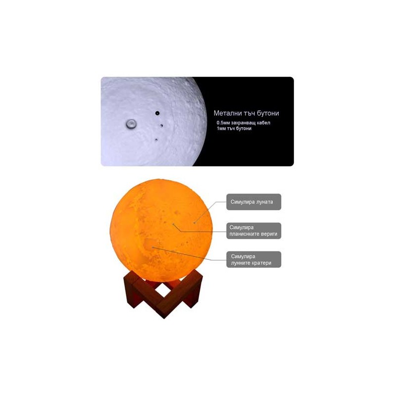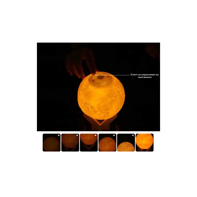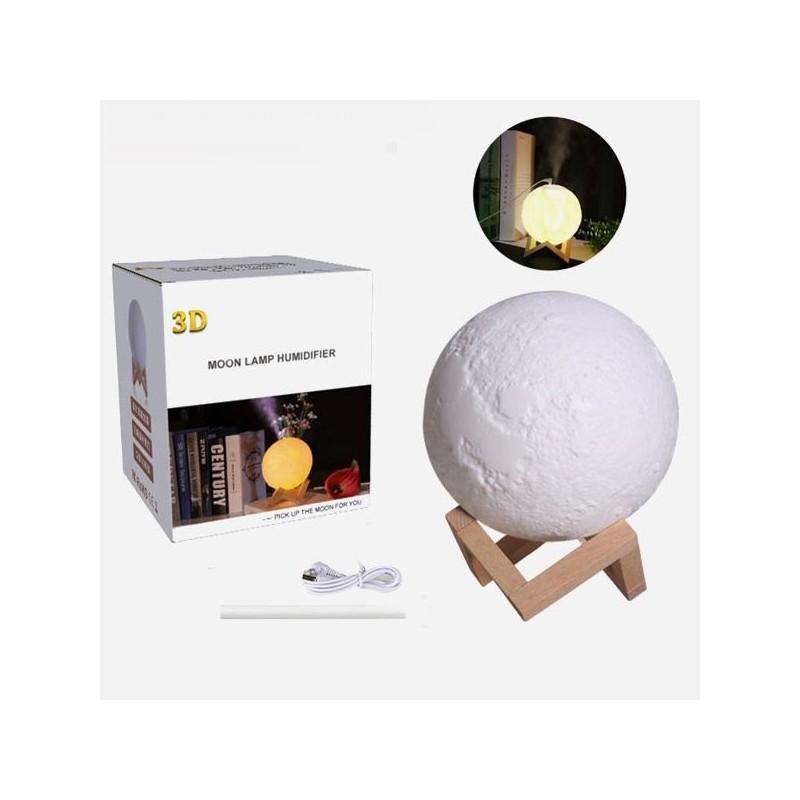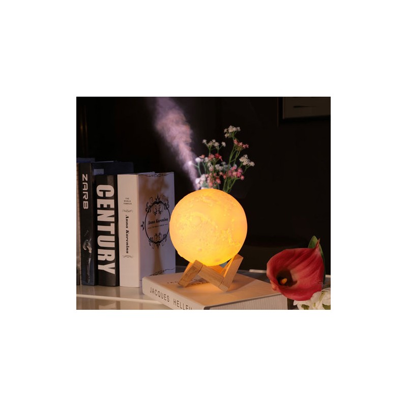 Нощна лампа тип дифузер и овлажнител свети в 3 цвята. С реалистичната си 3D форма копира истинския релеф на Луната, и лампата преминава през всички нейни фази с 3 сменящи се режима на светене чрез докосване. Светлината и е мека и ненатрапчива. Осигурява приятна, успокояваща атмосфера.