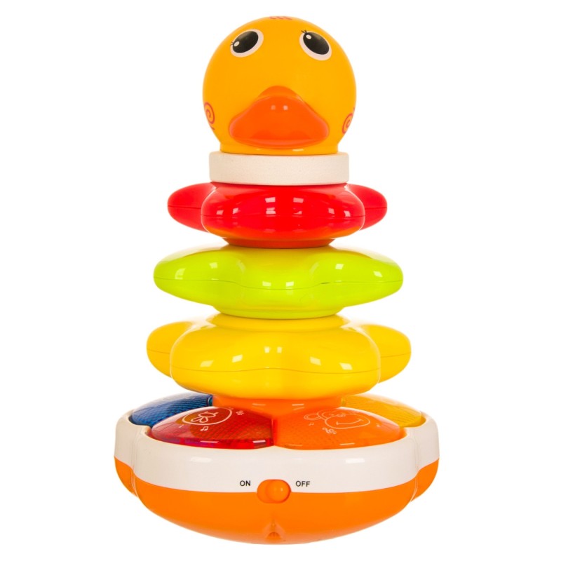 Играчката развива уменията на бебето, чрез решаване на задачи и подреждане на ринговете в правилен ред по големина, а звуците и светлините развиват неговите сетива.