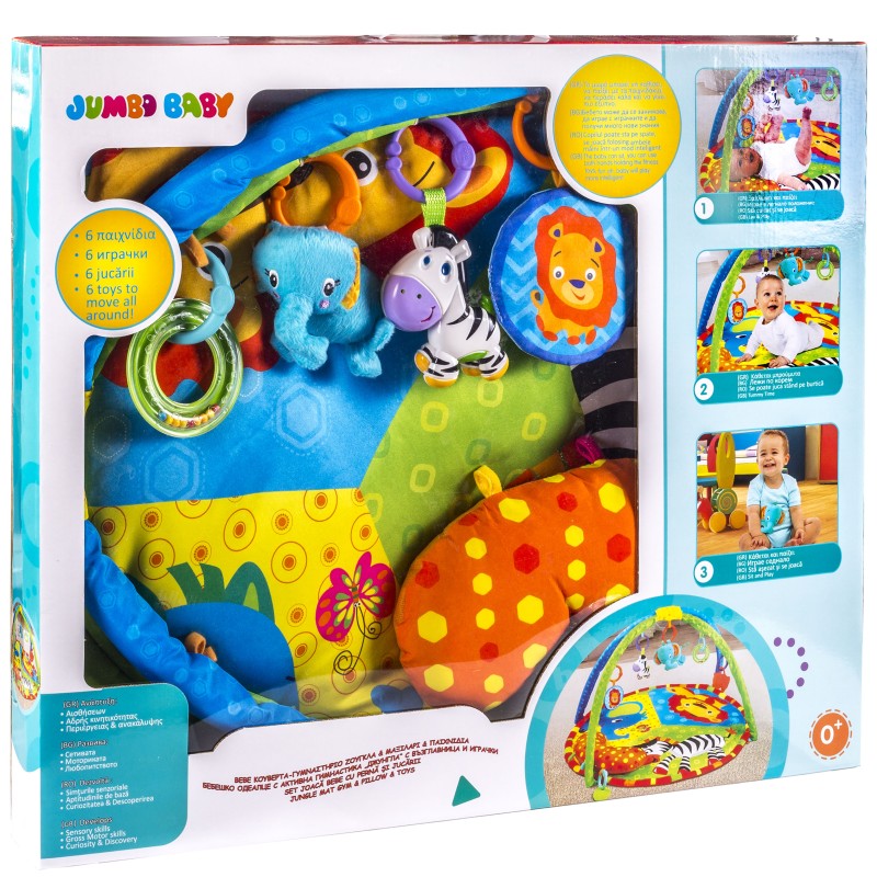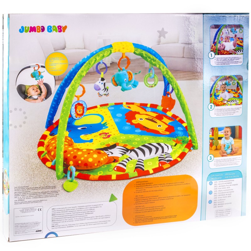 С 6 различни закрепящи се плюшени играчки във формата на животни от джунглата, които ще ангажират вниманието на детето върху една удобна, подплатена, преносима, занимателна постелка за игра с две меки арки над главата.
