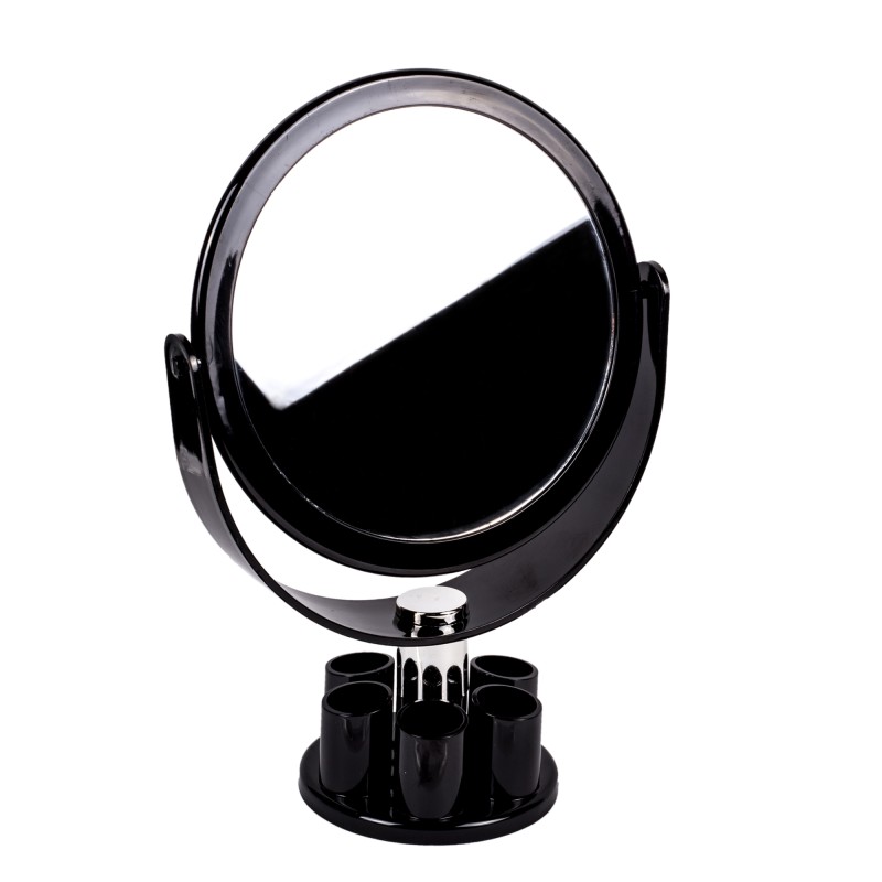 Кръгло настолно огледало с рамка от висококачествена пластмаса в черен цвят с 6 поставки за червила и гримове.