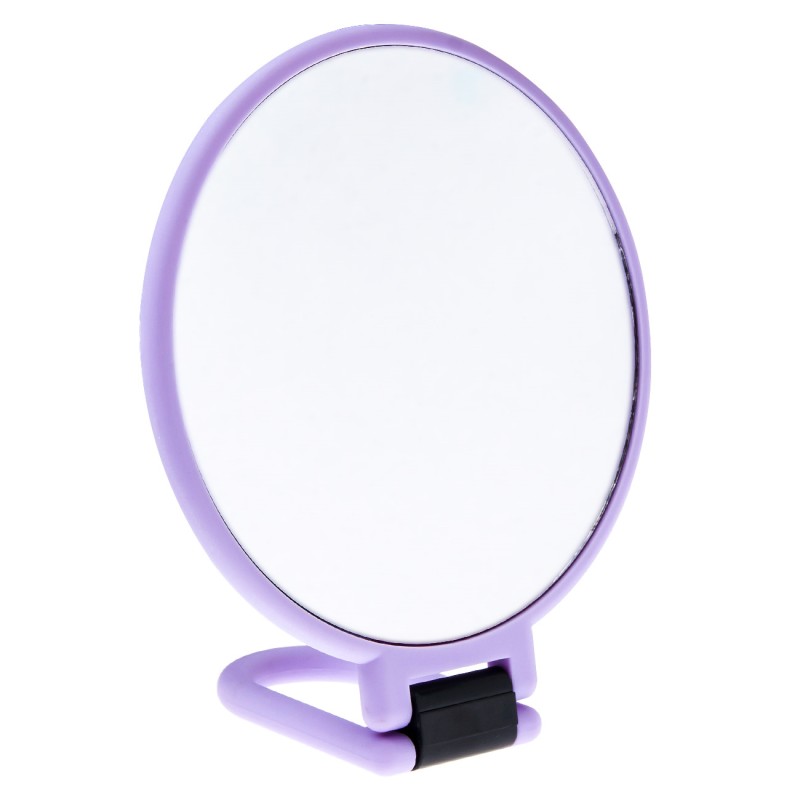 Кръгло огледало с пластмасова рамка в светло лилав цвят и чупеща дръжка, която става и на поставка и го превръща в настолно.