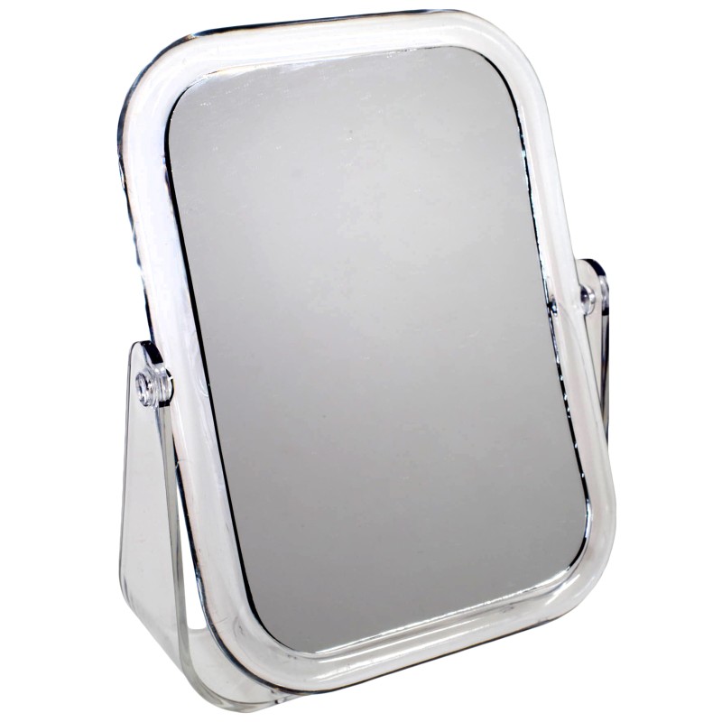 Правоъгълно настолно огледало с рамка от здрава и устойчива прозрачна пластмаса.