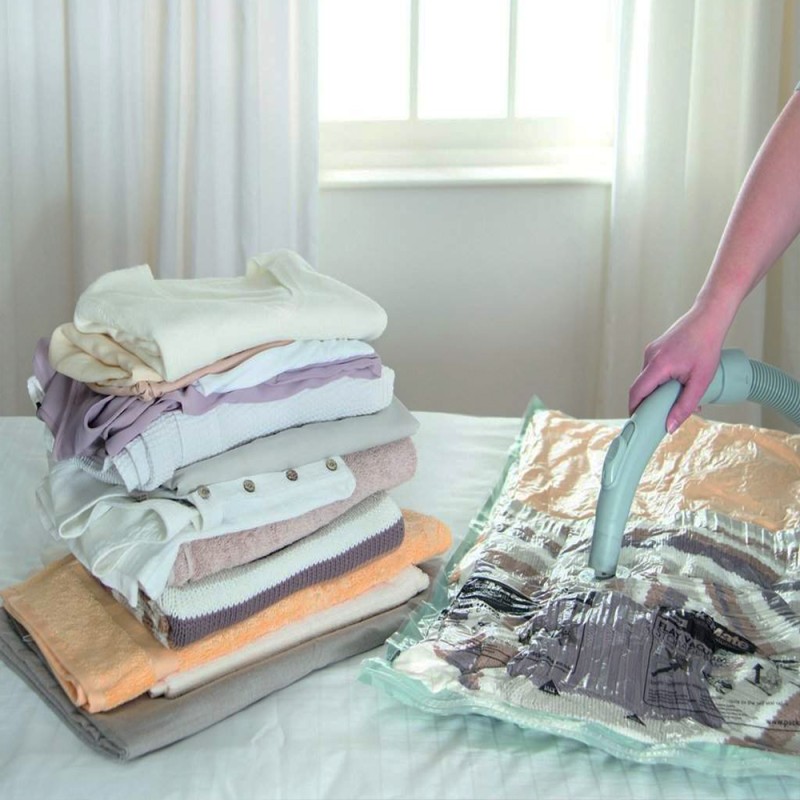 Сгъвате внимателно дрехите, които ще консервирате или пренасяте с куфар, затваряте ципа и със силата на вакуума на прахосмукачката ви изтегляте въздуха от торбата.