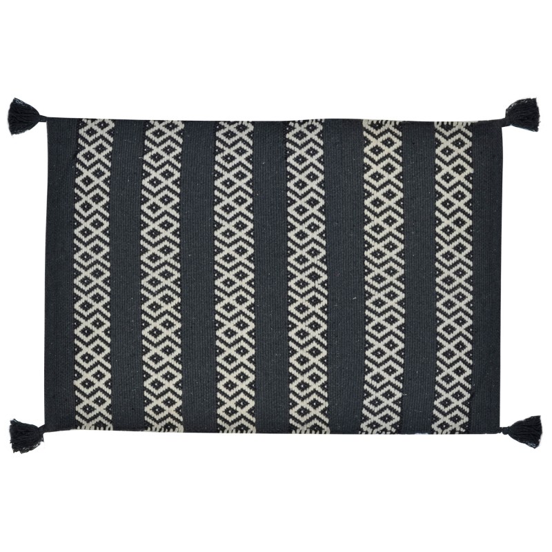 Постелка за под, изработена от памук в черно райе и черно-бели ромбоиди с декоративни пискюли в четирите края.