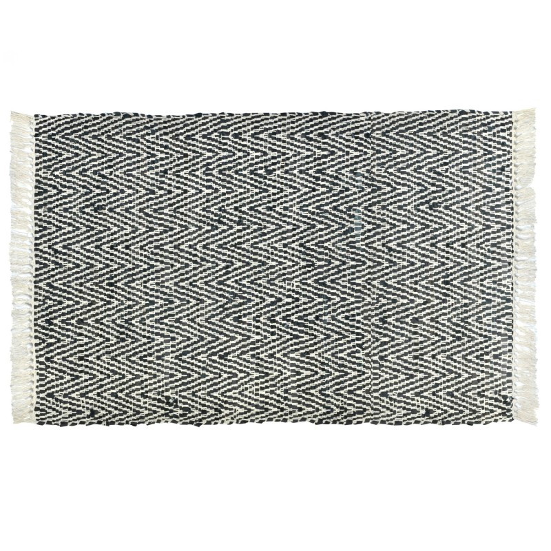Постелка за под, изработена от памук с черно-бели шарки и декоративни ресни от двете страни.